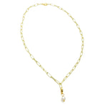 A 19 inch gold plated paperclip chain with a lobster clasp that can be fastened in any paperclip link to shorten the necklace to your desired length. A removeable 8mm freshwater pearl and gold wire-wrapped charm is clasped in the center for the trendy charm necklace look. Add more of your favorite charms clustered together in the front or spaced out across the paperclip links for fun new looks.