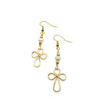 The Sacred earring features a delicate looping gold wire cross hanging from a gold wire link accented by a freshwater pearl nestled between two gold beads. Completed with comfortable fishhook ear wires, this elegant piece offers a meaningful and graceful addition to your everyday collection. 2 inch total length