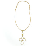 The Sacred necklace features a bold gold wire cross that gracefully cradles a freshwater pearl at its center. Suspended from a link of gold beads and a freshwater pearl, this pendant creates a meaningful focal point. The adjustable cream nylon cord ensures it will work with every neckline. 17-24 inch adjustable length