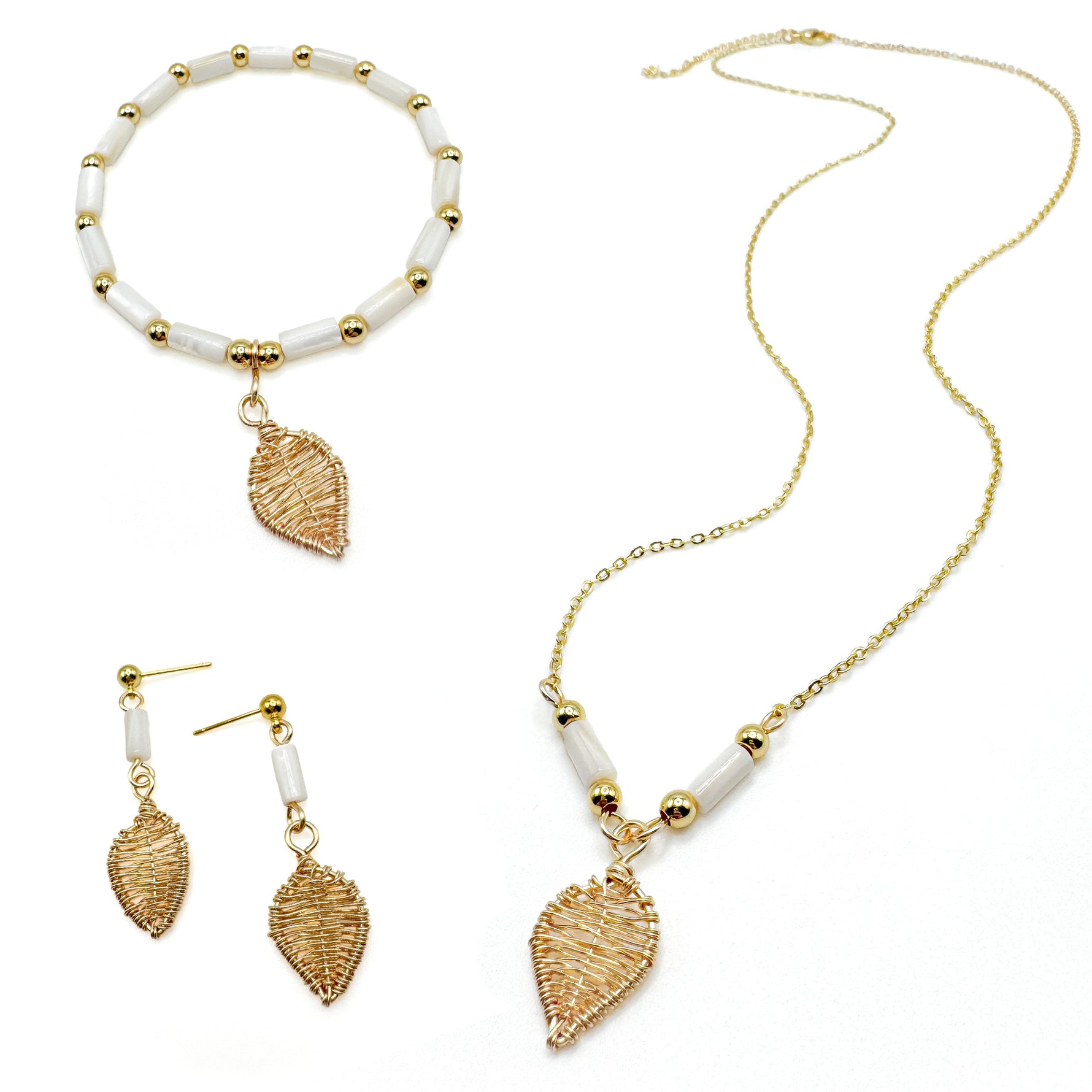 The Aspen earring showcases artisan-crafted gold wire leaf charms hanging delicately from a gold wire link. A shimmering mother of pearl cylinder bead adds elegance, while the gold ball post ensures comfortable, secure wear. 1 1/2 inch total length