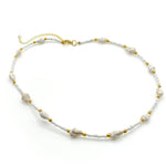 Mini-conch shells, pearlescent seed beads and gold round spacer beads form this beachy necklace that will make every day feel like vacation. 16 1/2 - 19 1/2 inches long with a lobster clasp and 3 inch extender.
