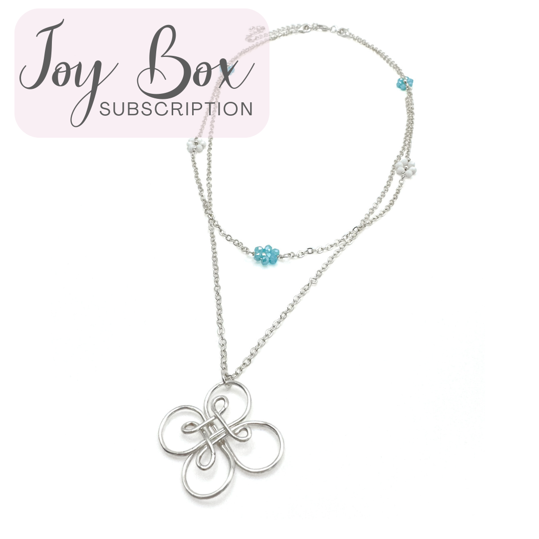 Two strands create a layered masterpiece or give you the option to layer with other Alegria favorites. The first strand is a 19 inch silver chain holding a 1 1/4 inch silver wire pendant. The chain has a lobster clasp on both ends so that it can be attached to the second strand or worn by itself. The second strand is a 17 inch silver chain with 5 crystal flowers of blue and white spaced around the chain. This strand has a 3 inch extender and lobster clasp, creating versatility.