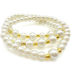 A set of 3 6 3/4 inch stretch bracelets with patterns of 8 and 10mm majorca pearls and gold spacer beads can be worn stacked for a statement or just one strand for a more subtle elegance.