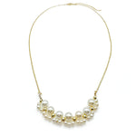 Like beautiful lace, our artisans have woven together 2 sizes of majorca pearls and spacer beads to form a 2 1/4 inch wide centerpiece to this bib style 21-24 inch adjustable gold plated necklace.