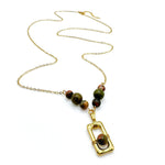 Anticipating sweater weather, we have the shades of fall featured in this 30 inch pendant necklace. A gold plated rectangle holds a gold wired agate and is suspended between two links of various sizes and shapes of agate in greens, browns and oranges. Adjustable from 30-33 inches with an extender and lobster clasp.