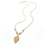 Delicately crafted with artisan skill, the Aspen necklace features a gold wire leaf pendant suspended between shimmering gold beads and luminous mother of pearl cylinders. Set on a graceful gold cable chain, it offers an elegant, artisanal touch to all of your fall outfits. 24-27 inch adjustable length with lobster clasp and 3 inch extender.