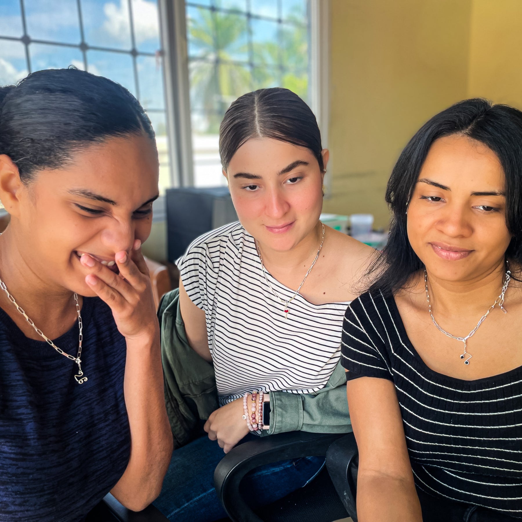 Two women sitting wearing gold charm necklaces