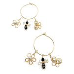 A one inch gold wire hoop earring with a hook and loop closure comes with 3 interchangeable gold charms. A gold wire flower charm with a majorca pearl center, a gold wire honeybee charm with black crystals, and a gold wire butterfly with 2 white majorca pearl wings. Wear the hoops by themselves, or add one or even two of the charms for a bolder, whimsical look.
