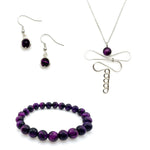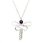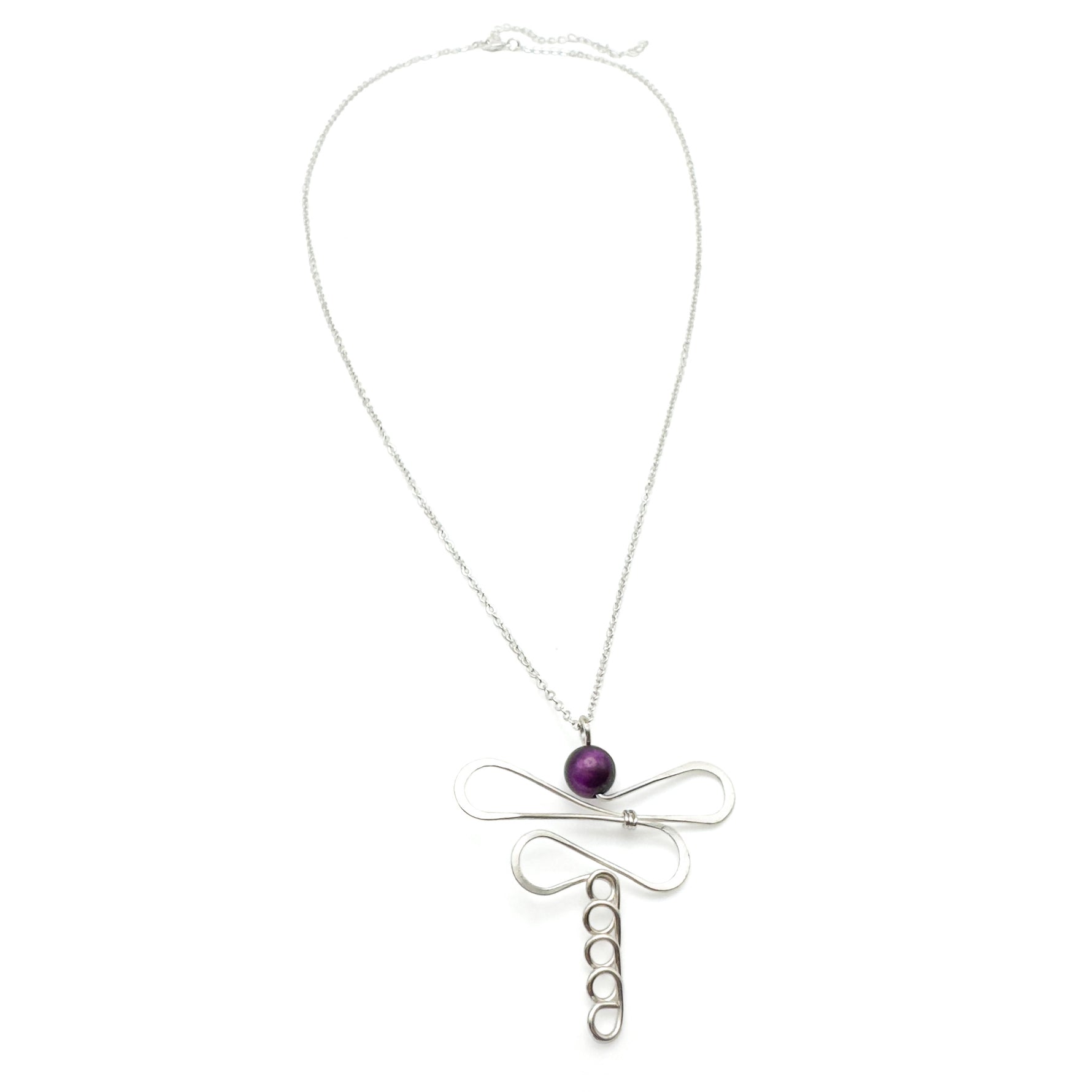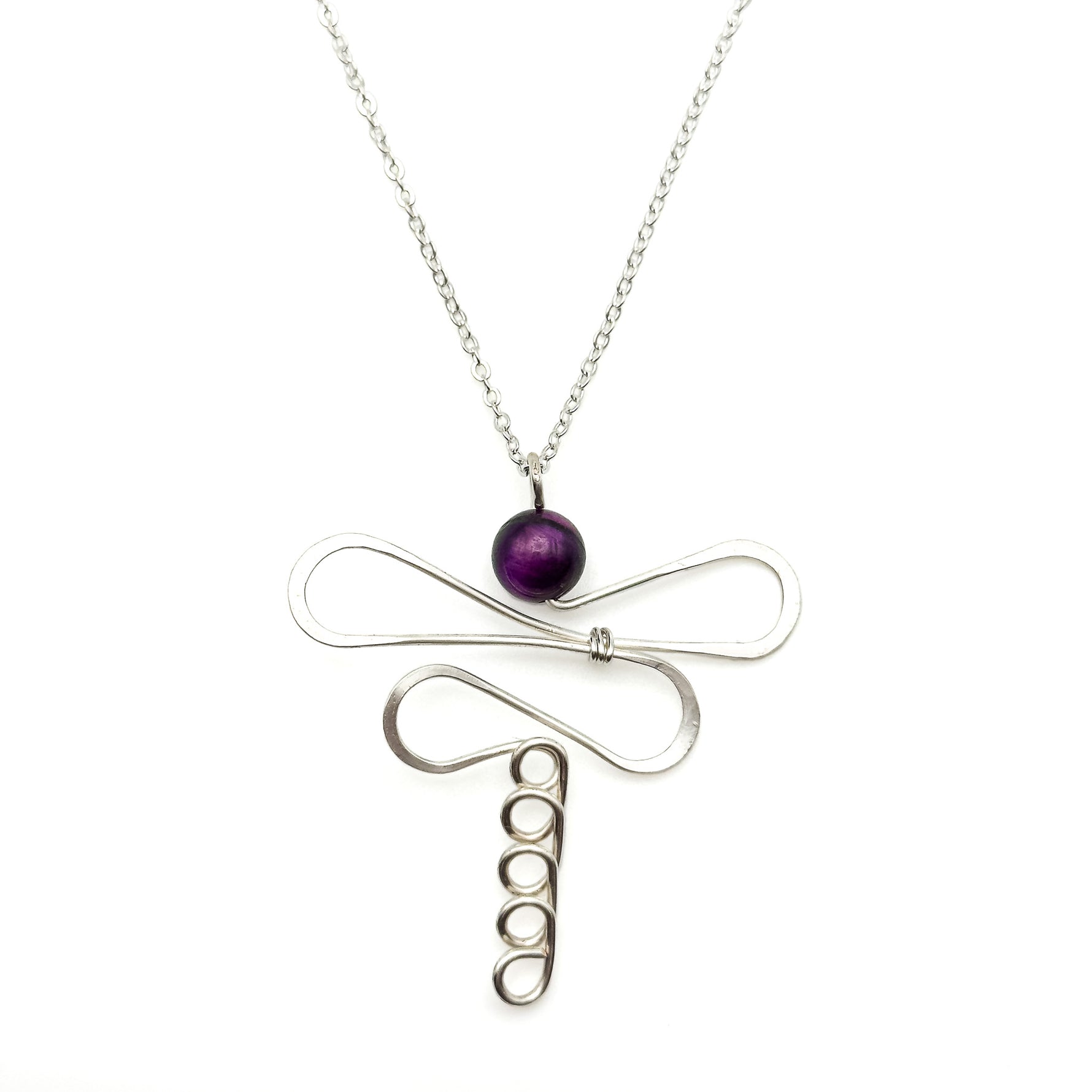 Hammered silver wire forms a dragonfly pendant with a deep purple 8mm tigers eye bead for the head. The 2 inch pendant hangs from 21 - 24 inch silver chain with a lobster clasp and 3 inch extender.