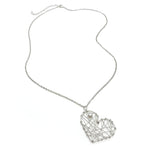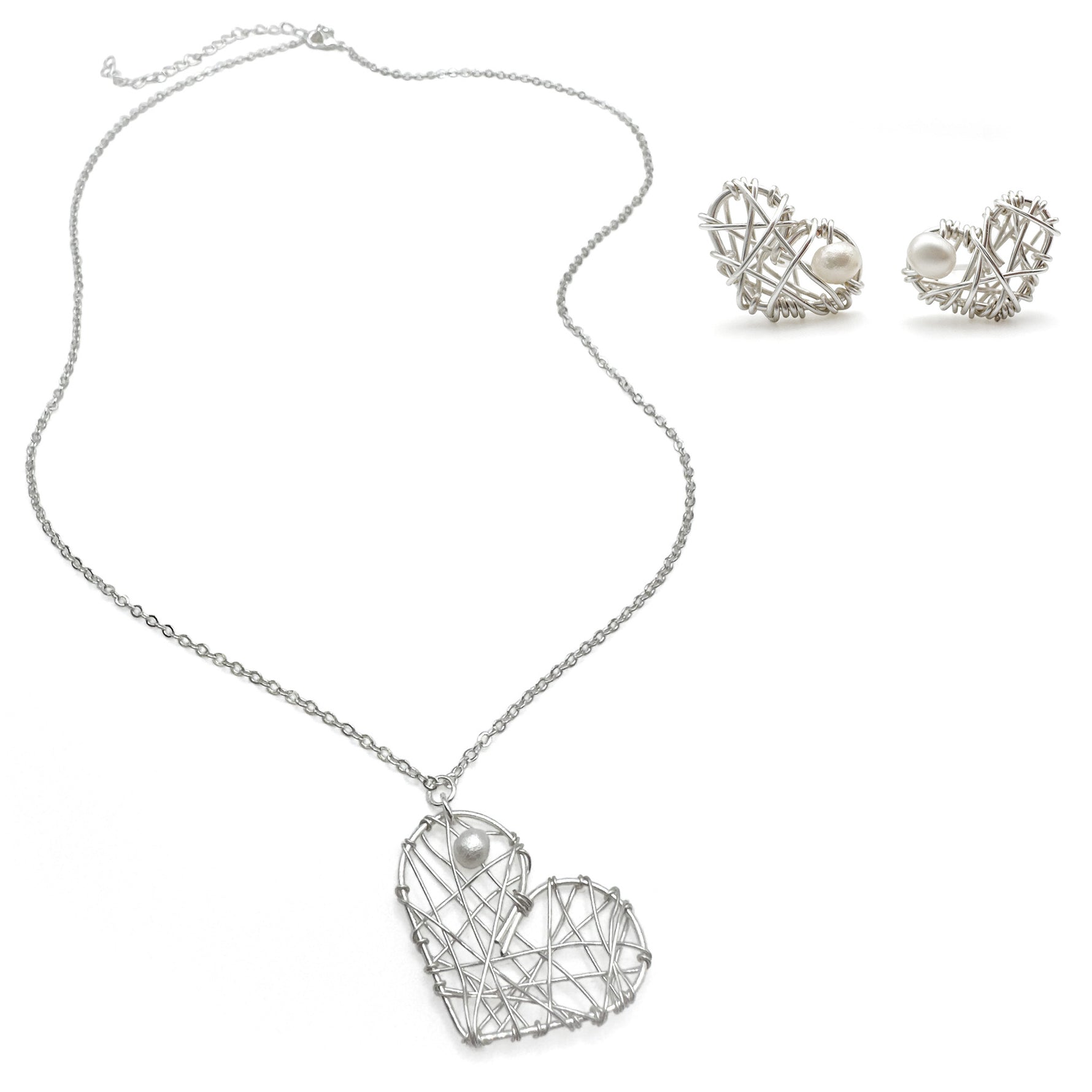 Silver wire criss-crosses a 1 1/2 inch silver wire heart pendant with a freshwater pearl woven to one side. The pendant hangs playfully from a bail on the pearl side of the heart on a 20 inch silver chain with a lobster clasp and 3 inch extender.