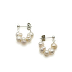 Five freshwater pearls are strung on a silver wire that form this 5/8 diameter huggie hoop completed with a silver ball post and butterfly backs.