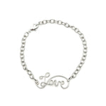 Silver wire is artfully formed into the word Love to form the centerpiece of this 8 1/2 inch adjustable silver chain bracelet.  Fasten the lobster clasp in any of the chain links to adjust to your wrist size.