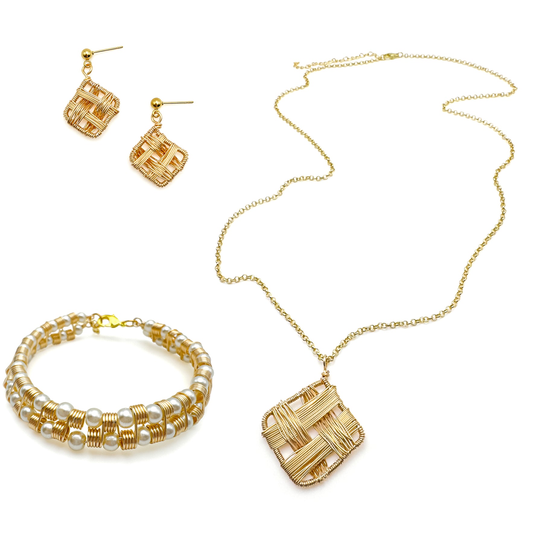 A 1 1/2 inch diamond shaped pendant of gold wire is decorated with a woven pattern of gold wire and hangs from a 27 to 30 inch adjustable gold rolo chain with a lobster clasp and 3 inch extender chain.