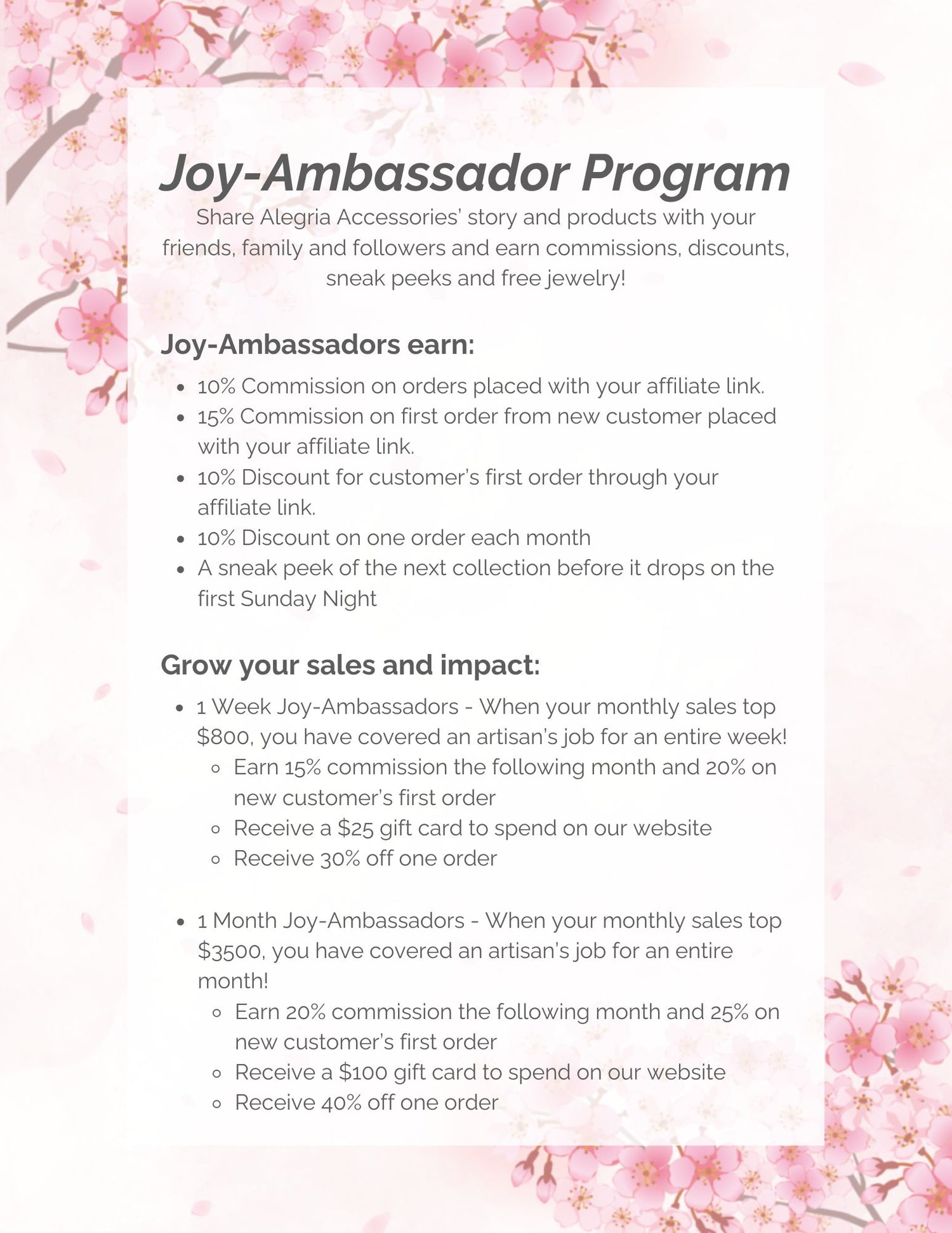 We are a fair trade handmade jewelry company that is creating safe, living wage jobs for marginalized women who grew up in an orphanage in Honduras. When you partner with us as an ambassador, you will receive a discount code for your followers, discounts and free products based on your sales volume, sneak peeks of new launches and updates on the impact you and your followers are having on the lives of our artisans in Honduras!