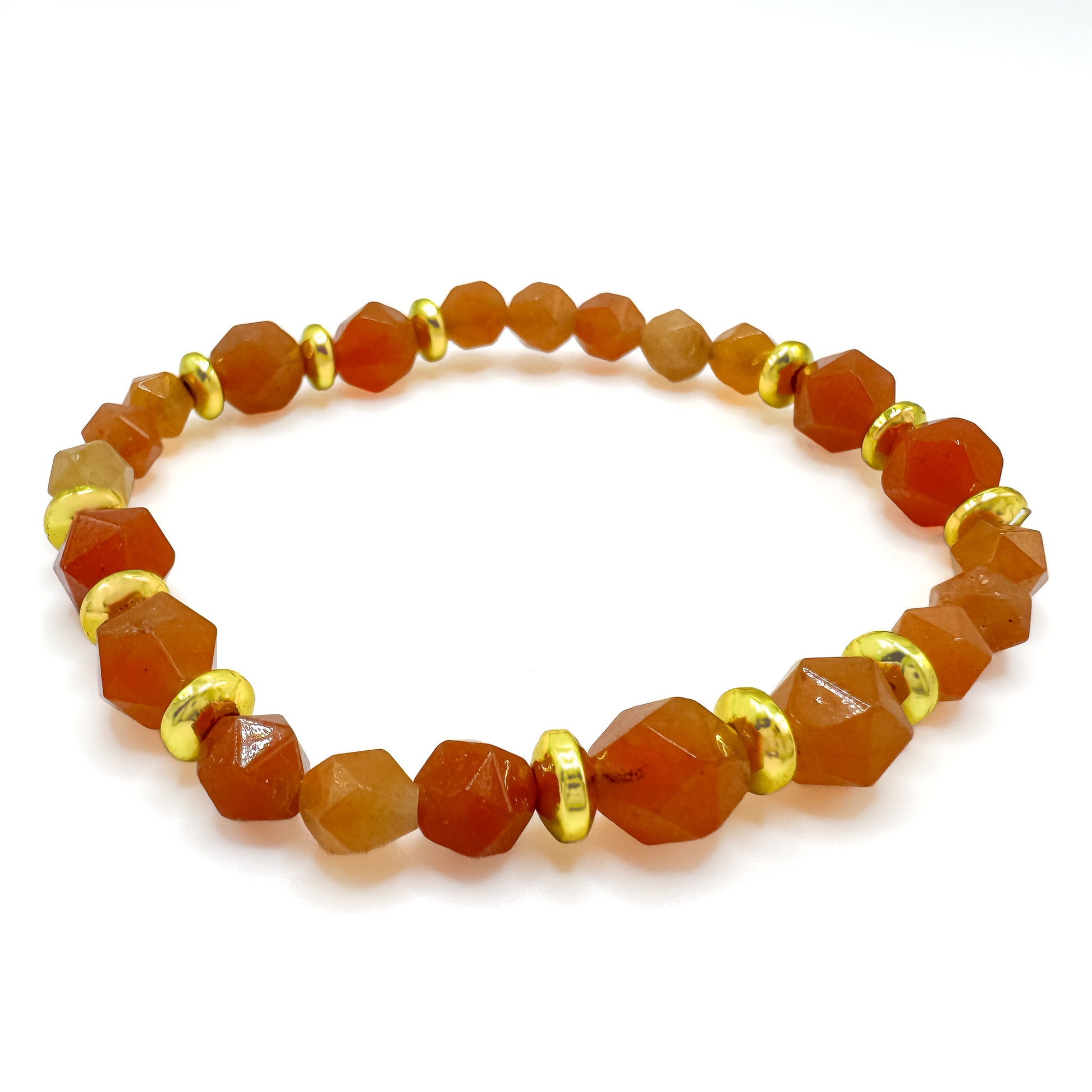 Various sizes and shades of amber hued faceted agates are beaded in a pattern with flat gold spacer beads into a luscious fall stretch bracelet. Fits a 6 1/2 - 7 inch wrist.