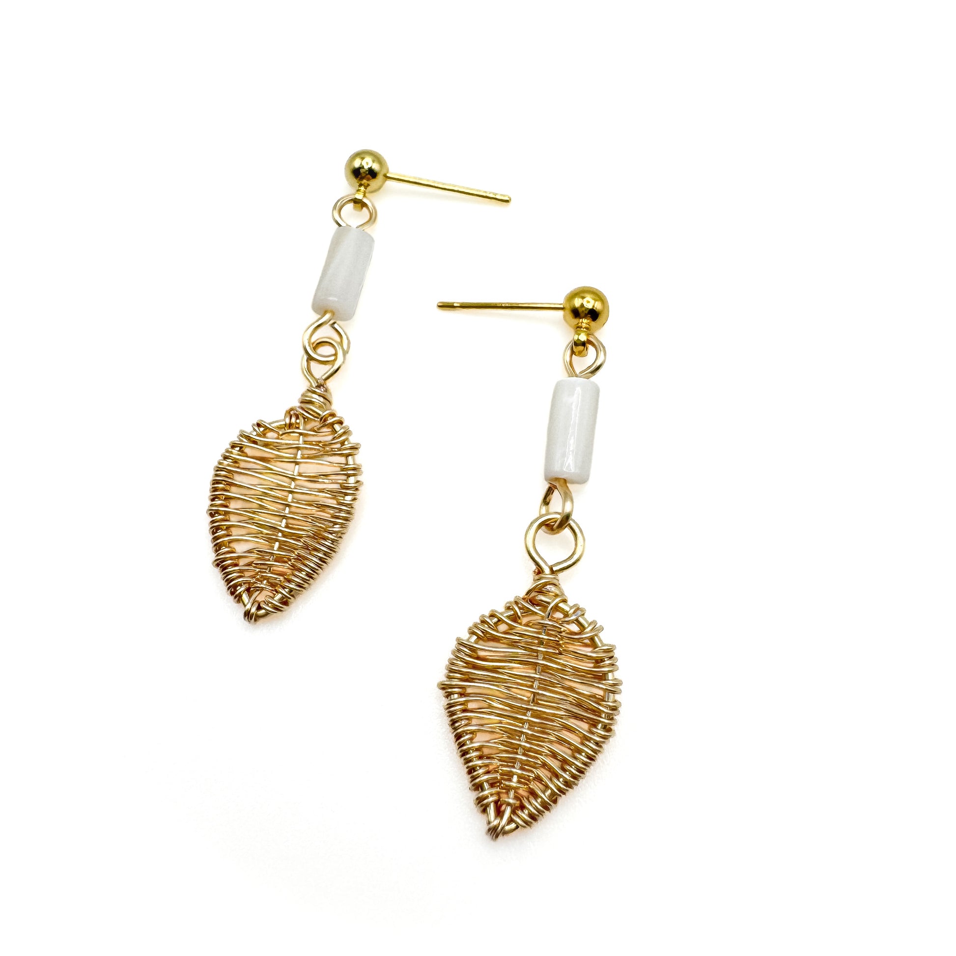 The Aspen earring showcases artisan-crafted gold wire leaf charms hanging delicately from a gold wire link. A shimmering mother of pearl cylinder bead adds elegance, while the gold ball post ensures comfortable, secure wear. 1 1/2 inch total length