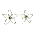 Artisan crafted silver wire flowers with a green crystal center are finished with a post for a whimsical statement stud earring. 1 inch diameter