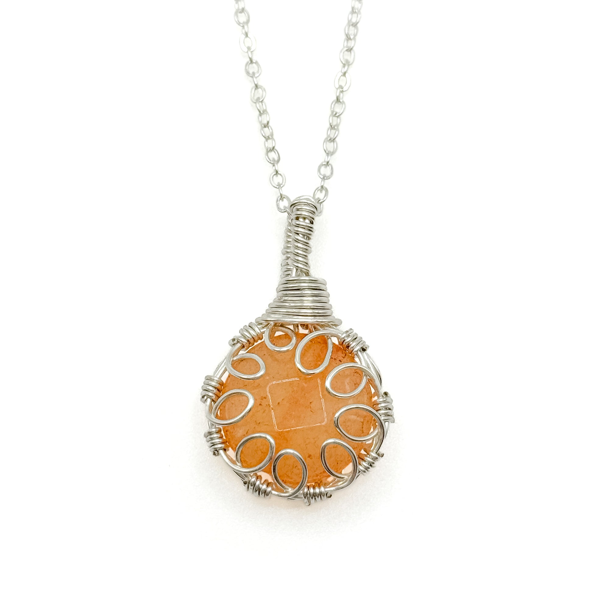 We are in our Joy-Creating Era with this hand wired silver masterpiece. A faceted peach agate is ensconced with loops of silver wire radiating from the frame of this setting on both sides. The top is a wire wrapped bail that allows the pendant to slide effortlessly on a dainty silver plated cable chain. 19-22 inch adjustable length with a lobster clasp and 3 inch extender