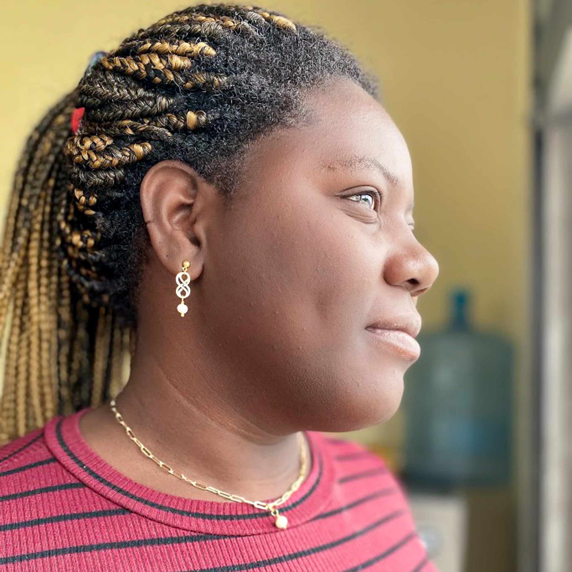 2 hammered gold plated wire infinity symbols hang from a gold plated ball post earring and hold a wire wrapped freshwater pearl.