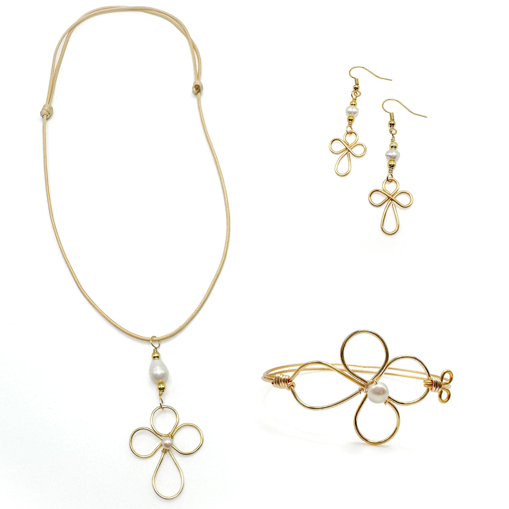 The Sacred bracelet showcases a striking gold wire cross with graceful loops and a freshwater pearl centerpiece. Crafted on a gold wire cuff, it features an artisan-designed safety hook for secure, comfortable wear. Fits a 6 1/2 - 7 1/4 inch wrist